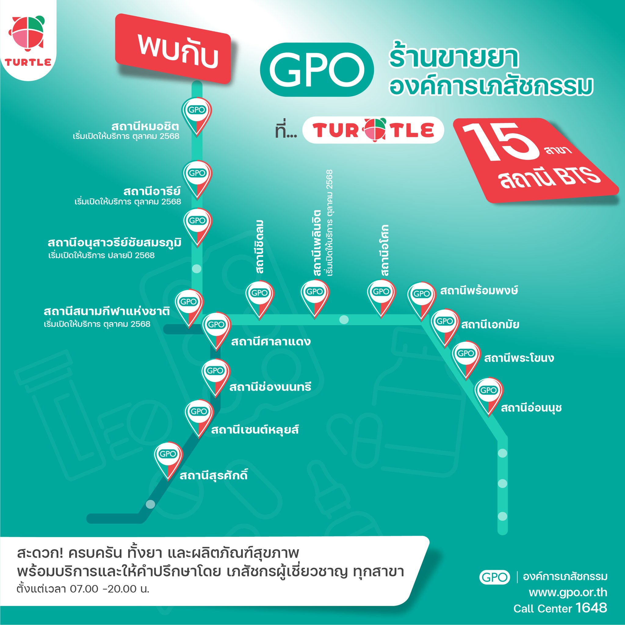 ทั้งนี้ องค์การเภสัชกรรม ระบุเพิ่มเติมผ่านเฟซบุ๊กแฟนเพจว่า ร้านขายยา GPO METRO SKY จะให้บริการภายในร้าน Turtle Shop บนสถานีรถไฟฟ้า BTS รวม 15 สถานี ตั้งแต่เวลา 07.00-20.00 น. โดยมีกำหนดเปิดให้บริการดังนี้
