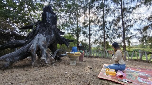 น.ส.ปุณณ์ภัสสร เล่าว่า ก่อนหน้านี้ เมื่อประมาณปลายปี 2566 ทางไร่พยายามที่จะปรับปรุงสถานที่ท้ายไร่ที่มีลำน้ำลำเชียงสาไหลผ่าน โดยการลอกริมลำคลองให้มีความสวยงาม และไปพบกับตอตะเคียนจมอยู่ใต้น้ำบริเวณนั้น