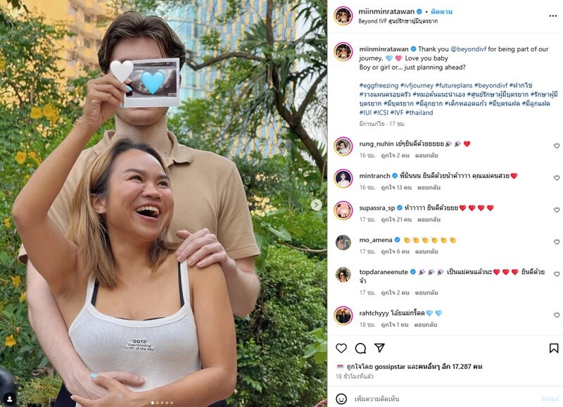 พร้อมทั้งแคปชั่นด้วยว่า “Thank you @beyondivf for being part of our journey. Love you baby Boy or girl or… just planning ahead? #eggfreezing #ivfjourney #futureplans #beyondivf #ฝากไข่ #วางแผนครอบครัว #หมอต้นแนะนำเอง #ศูนย์รักษาผู้มีบุตรยาก #รักษาผู้มีบุตรยาก #มีบุตรยาก #มีลูกยาก #เด็กหลอดแก้ว #มีบุตรแฝด #มีลูกแฝด #IUI #ICSI #IVF #thailand”