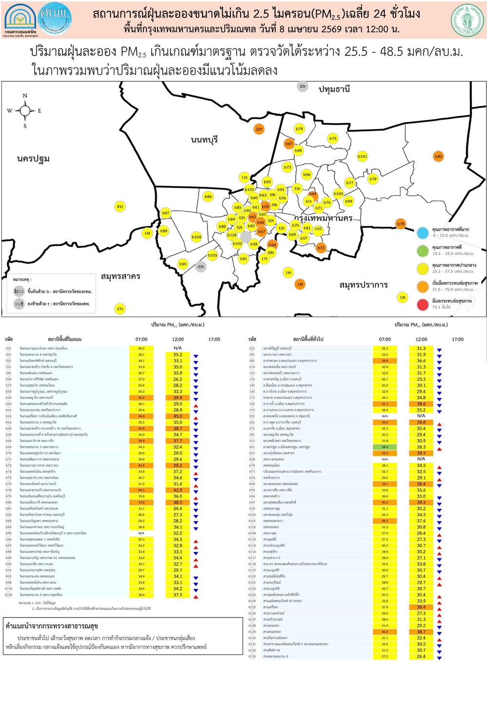 สำหรับประชาชนที่อยู่บริเวณพื้นที่มีผลกระทบต่อสุขภาพ (พื้นที่สีแดง) ควรหลีกเลี่ยงกิจกรรมกลางแจ้ง หรือใช้อุปกรณ์ป้องกันตนเอง หากมีอาการทางสุขภาพควรปรึกษาแพทย์ ทั้งนี้สามารถติดตามสถานการณ์ผ่านทางเว็บไซต์ Air4Thai.com และ airbkk.com แอปพลิเคชัน Air4Thai และ AirBKK