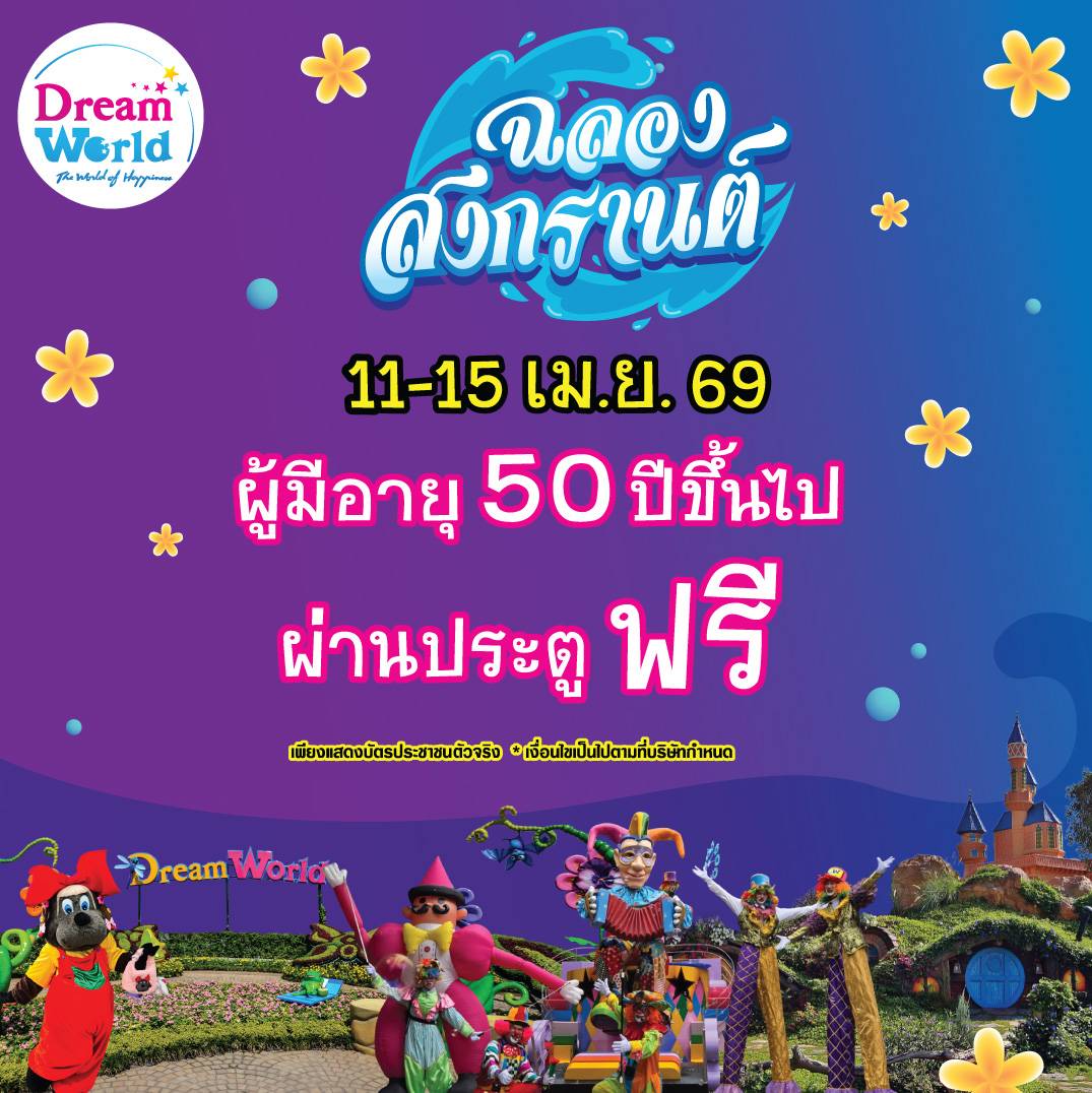ดรีมเวิลด์ชวนเที่ยววันสงกรานต์ 2569 ผู้มีอายุ 50 ปีขึ้นไปผ่านประตูฟรี เพียงแสดงบัตรประชาชน ตั้งแต่ 11-15 เมษายนนี้ พร้อมโปรโมชั่นแลกซื้อบัตรรวมเครื่องเล่นราคาพิเศษ จนถึง 10 พฤษภาคมนี้
