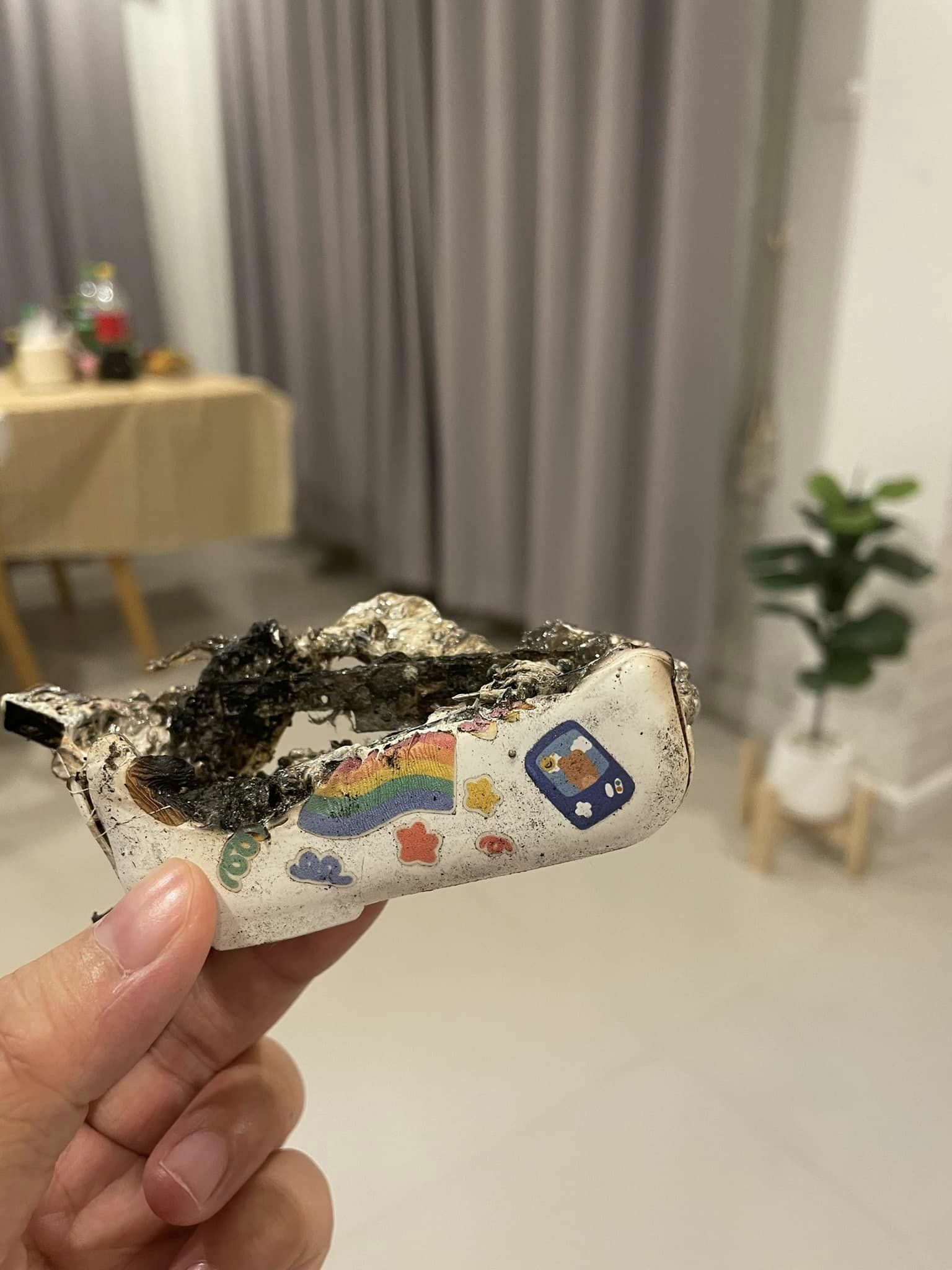 ภาพที่เห็นคือ (ตามภาพเลย) จากเครื่องเท่าฝ่ามือ เหลือนิดเดียว โต๊ะไหม้เกือบทะลุ ย้ำว่า”ไม่ได้ชาร์จทิ้งไว้แต่อย่างใด” วางไว้เฉยๆบนโต๊ะ น่าจะเพราะอากาศที่ร้อน จึงทำให้เกิดเหตุการณ์นี้ และวางใกล้กับหูฟังด้วย พังทั้งคู่
