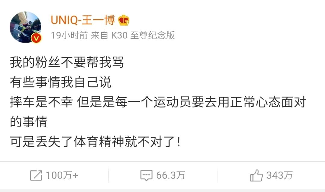 ข้อความดังกล่าวระบุว่า“แฟนคลับของผมไม่ต้องช่วยผมด่า มีบางเรื่องผมต้องพูดเอง รถล้ม คือ โชคไม่ดี แต่ว่านักกีฬาทุกคนต้องเผชิญกับสิ่งที่เกิดขึ้นด้วยจิตใจที่ปกติ แต่การสูญเสียน้ำใจนักกีฬามันไม่ถูกต้อง!” จากโพสทำให้แฟนคลับเดือดทันทีและรวมตัวกันออกมาพูดถึงเรื่องนี้ เล่นเอาชื่อของคู่แข่งหมายเลข 18 อย่าง หูถงหมิง ขึ้นเทรนด์ค้นหาอันดับสองในเว่ยป๋อ