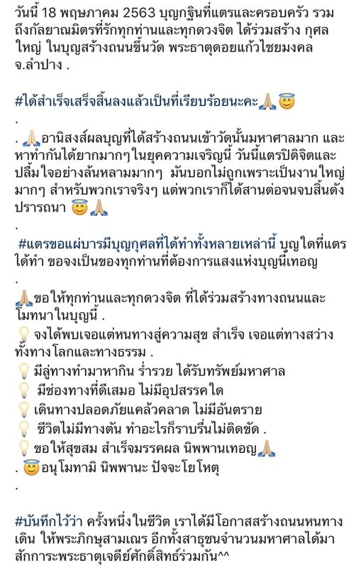 “เดินทางปลอดภัยแคล้วคลาด ไม่มีอันตราย ชีวิตไม่มีทางตัน ทำอะไรก็ราบรื่นไม่ติดขัด ขอให้สุขสม สำเร็จมรรคผล นิพพานเทอญ อนุโมทามิ นิพพานะ ปัจจะโยโหตุ #บันทึกไว้ว่า ครั้งหนึ่งในชีวิต เราได้มีโอกาสสร้างถนนหนทางเดิน ให้พระภิกษุสามเณร อีกทั้งสาธุชนจำนวนมหาศาลได้มาสักการะพระธาตุเจดีย์ศักดิ์สิทธ์ร่วมกัน^^”