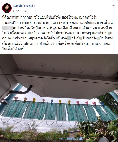 ล่าสุดเฟซบุ๊กเพจ "แหม่มโพธิ์ดำ" ได้โพสต์ภาพ หน้ากากอนามัยแบบใช้แล้วทิ้งของโรงพยาบาลแห่งหนึ่ง ซึ่งถูกนำมาซักแล้วตากไว้เพื่อนำมาใช้ใหม่ หลังช่วงนี้หน้ากากอนามัยขาดแคลนอย่างหนัก หลังโพสต์ดังกล่าวเผยแพร่ไปก็มีคนเข้ามาแสดงความคิดเห็นจำนวนมาก