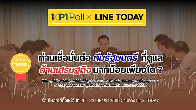 LINE TODAY ร่วมกับ สถาบันพระปกเกล้า สำรวจความคิดเห็น "ท่านเชื่อมั่นต่อทีมรัฐมนตรีที่ดูแลด้านเศรษฐกิจ (เช่น ศุภจี: พาณิชย์, เอกนิติ: คลัง, สุริยะ: เกษตร, พิพัฒน์: คมนาคม, เอกนัฏ: พลังงาน, วราวุธ: อุตสาหกรรม, สุรศักดิ์: ท่องเที่ยวและกีฬา, ไชยชนก: ดิจิทัล) มากน้อยเพียงใด?" ร่วมโหวตได้ตั้งแต่วันที่ 20 - 23 เมษายน 2569 ผ่านทาง LINE TODAY