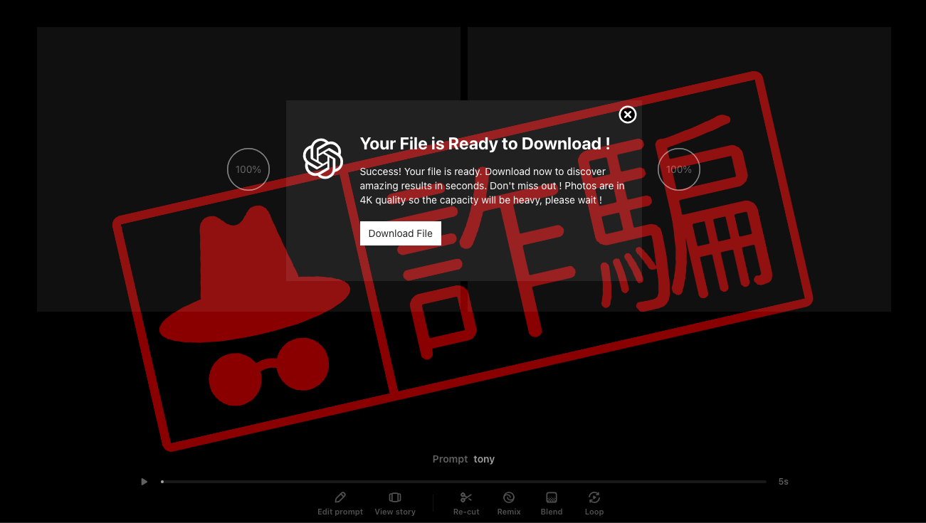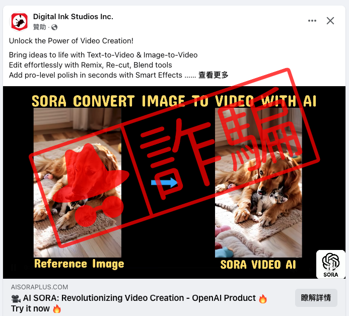 近期民眾回報臉書出現 AI 工具的詐騙廣告影片投放,偽裝成「Sora AI」並說可以讓你用簡單的描述文字生成逼真的影片,最後誘導你下載 AI 生成完成的片段。事實上若進行下載的動作,很可能會遭到惡意軟體攻擊,過去 MyGoPen 也有揭露類似手法。建議大家務必要到相關工具的官方網站,若看到類似的不明社群廣告貼文務必要當心,切勿貿然下載!
