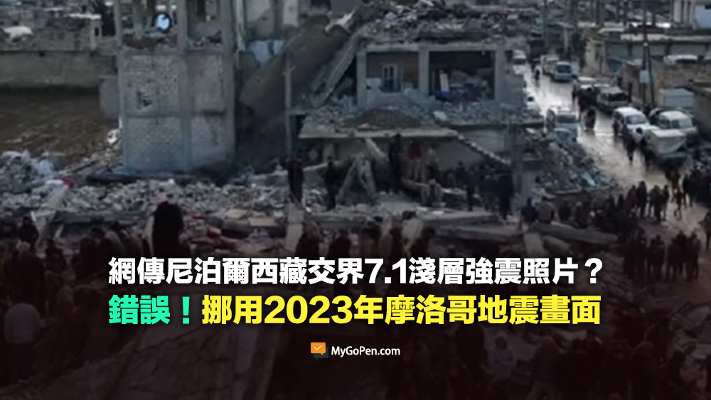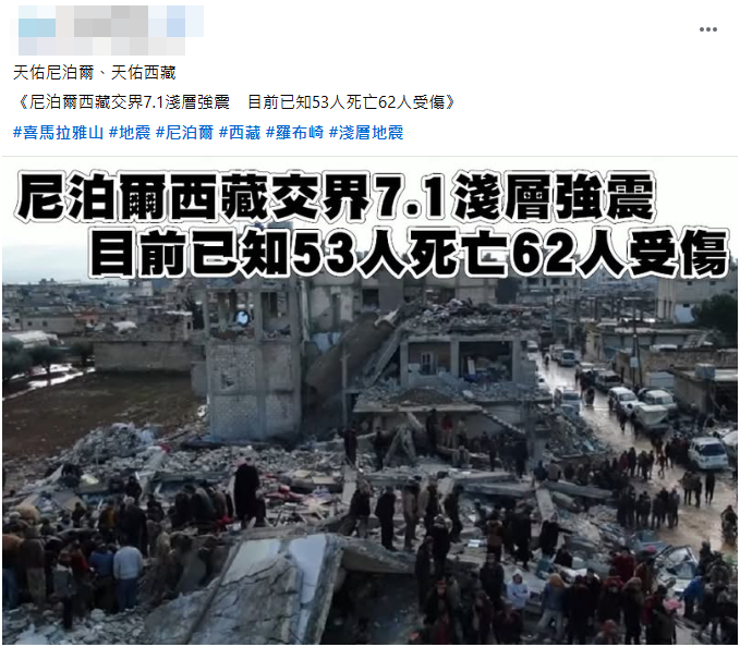 網傳「尼泊爾西藏交界7.1淺層強震」、「目前已知53人死亡62人受傷」的訊息和圖片。經查證,傳言照片和近日西藏強震無關,實為 2023 年摩洛哥發生規模 6.8 地震後,荷蘭 RKC 瓦爾韋克足球俱樂部在當地協助災民的紀錄片畫面,該起地震造成 2,600 多人死亡、5,600 多人受傷。傳言挪用無關事件之畫面,為錯誤訊息。