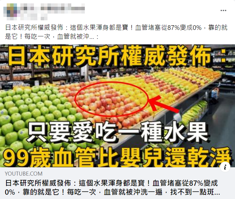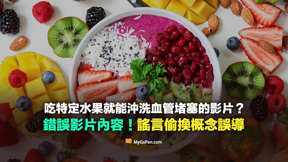 網傳「日本研究所權威發佈」、「這個水果渾身都是寶」的影片內容,宣稱可讓血管堵塞從 87% 變成 0%,能靠單一特定水果,就能達到「每吃一次血管就被沖洗一遍」的效果。專家表示無法直接透過攝取水果達到活血、化血塊,甚至「沖洗血管」的功能,不可能光靠單一種水果達到謠言中所稱的效果,民眾應該追求均衡飲食、足量攝取蔬果。影片標題與內容說法為錯誤資訊。