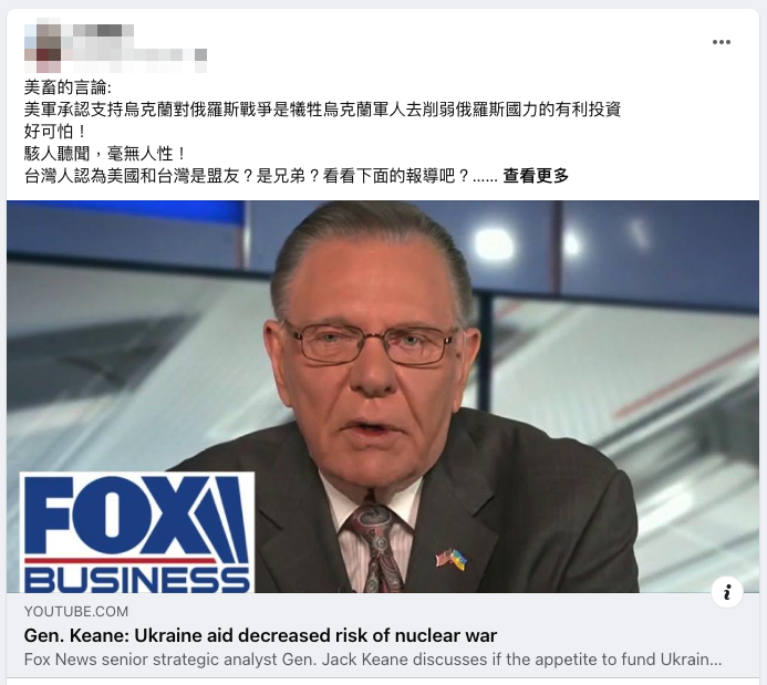 網傳「美軍承認支持烏克蘭對俄羅斯戰爭是犧牲烏克蘭軍人去削弱俄羅斯國力的有利投資」的訊息。經查證,傳言取自美國退役四星陸軍上將基恩 2022 年接受《Fox Business》訪問的影片,內容是他對於美國繼續援助烏克蘭的想法,他表示,在他看來,援助烏克蘭是美國對未來安全的投資,並沒有說過「在跟俄羅斯的戰爭中,爲美國利益送命的不是美國人,而是烏克蘭人」這樣的話;而基恩在敘述普丁一直想讓烏克蘭成為俄羅斯的一部份時,提到習近平也對台灣這麼說過,傳言以此宣稱「『讓台灣人民』為美國人的利益,戰到最後的一兵一卒」為錯誤訊息。