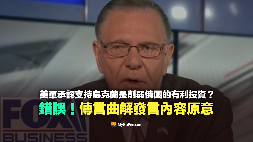 傳言出自 2022 年《Fox Business》在 YouTube 上傳的影片,內容是訪問美國退役四星陸軍上將基恩對於持續援助烏克蘭的想法;但傳言曲解其發言,基恩也沒有說過「在跟俄羅斯的戰爭中,爲美國利益送命的不是美國人,而是烏克蘭人」這樣的話。