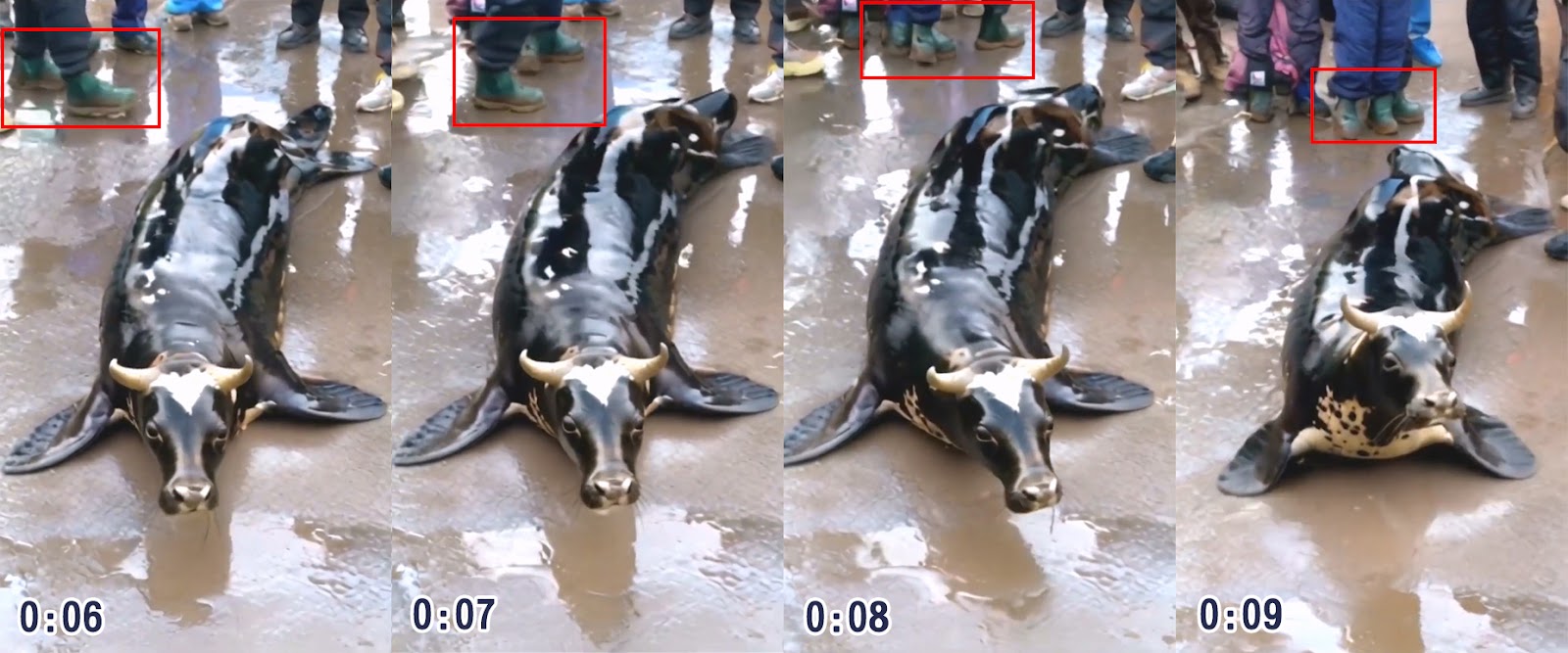 另一個更明顯的細節,可以觀察後方人群的鞋子變化。一名穿著綠色鞋子的圍觀群眾從左側走到畫面中間,原本是正常的左右腳(0:06),但移動的時後兩腳之間突然多生出一隻腳(0:07、0:08),最後就以三隻腳、而且鞋子前後顛倒的方式站立(0:09)。