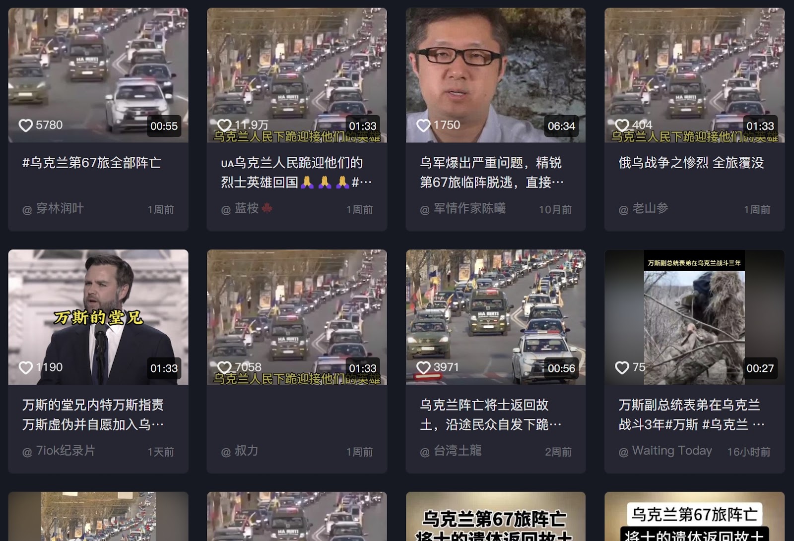 MyGoPen 以「烏克蘭第 67 旅、全體陣亡」等關鍵字在 Facebook 上搜索,發現相關影片大約從 2025 年 3 月 3 日開始流傳,且影片的浮水印皆為簡體字。以此作為線索,利用相同關鍵字在中國影音平台抖音上搜索,可以找到同時間有超過 20 名用戶上傳相似的影片。