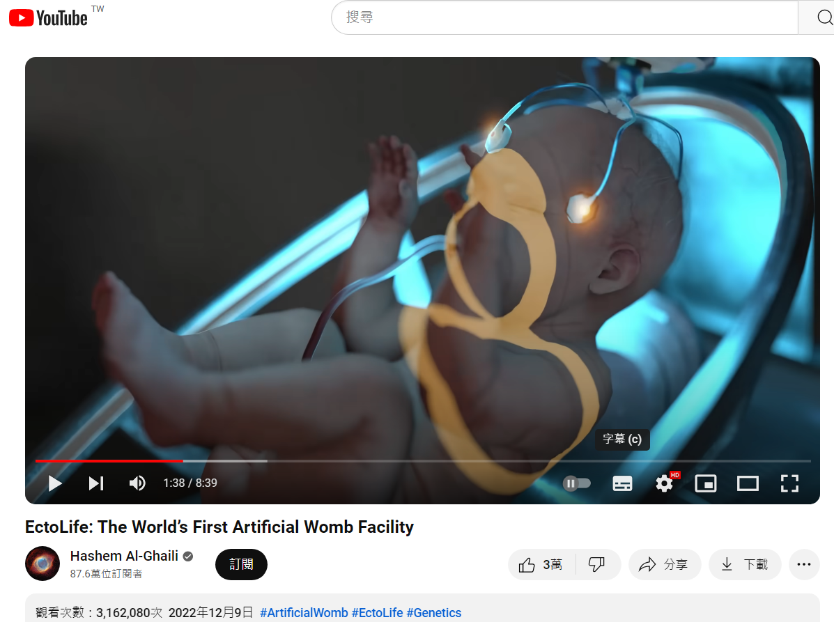 (一)透過影片反搜工具 InVID 分析網傳影片的關鍵畫面後進行搜尋,查找到其來自 YouTube 頻道「Hashem Al-Ghaili」在 2022 年 12 月 9 日上傳的影片,標題為:「EctoLife:世界上第一個人造子宮設備」(EctoLife: The World’s First Artificial Womb Facility),全長 8 分 39 秒。