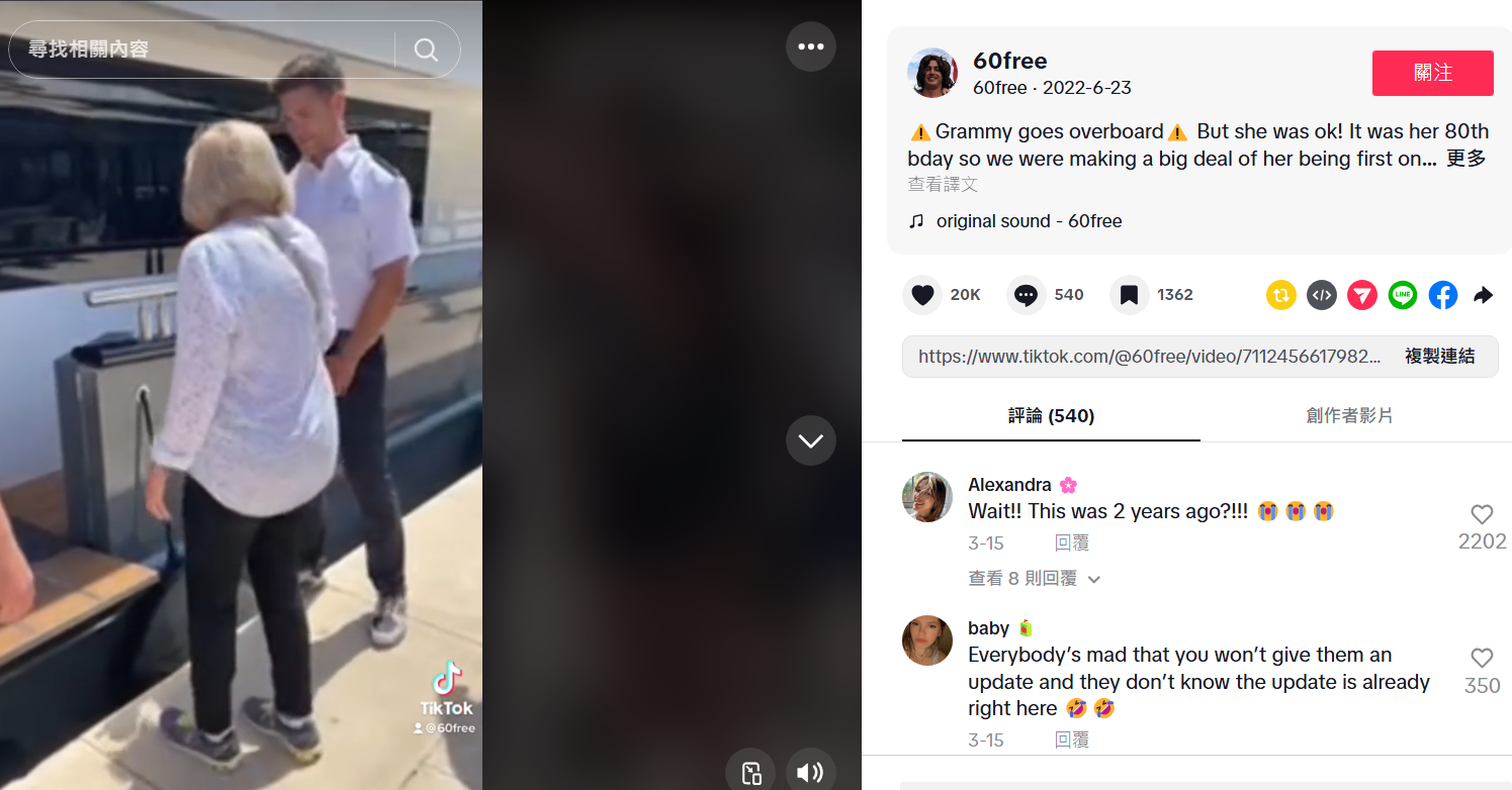 以此為線索在 TikTok 上搜尋,查找到帳號「60free」在 2022 年 6 月 23 日有發布一則較長的影片,此帳號是奶奶的孫子,貼文中表示當時是奶奶的 80 歲生日;此外,在這個踩空跌倒事件 2 週年,也就是今年,「60free」還特別又發了一個影片。