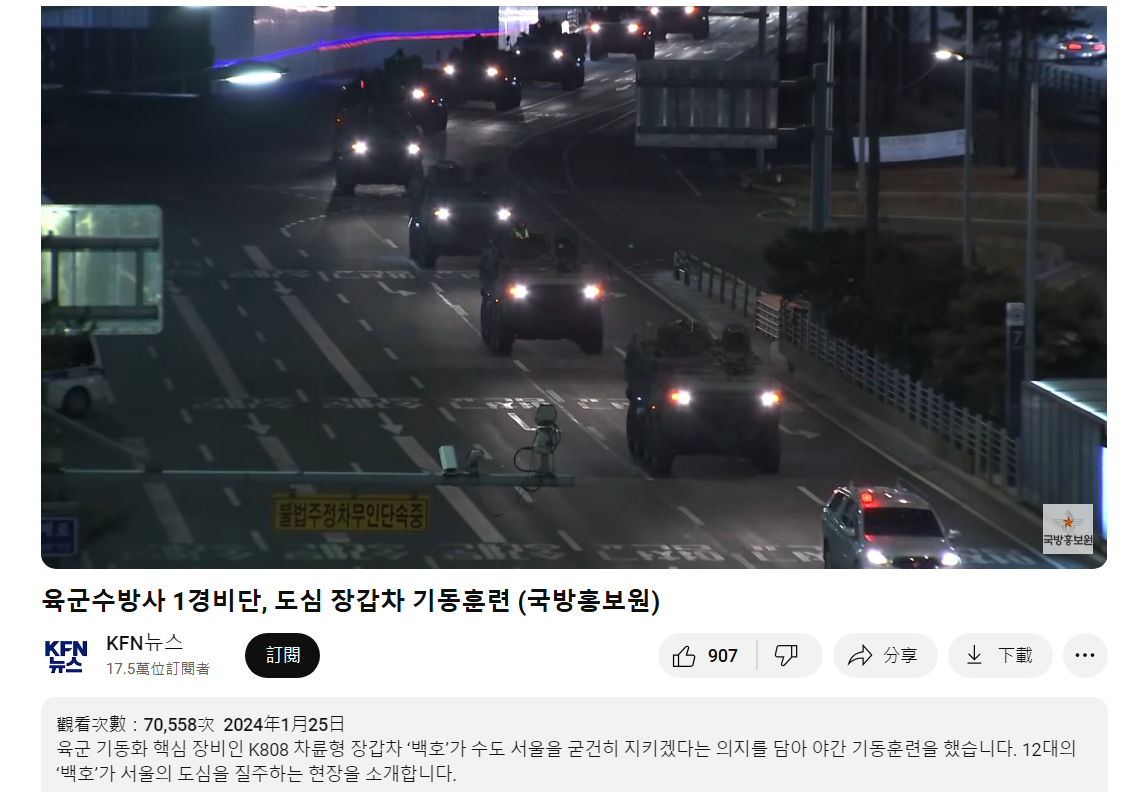 在影片中可看到,K808 裝甲車隊進入首爾市中心的畫面,和網傳照片及《首爾新聞》的新聞照片相同,只是亮度較低而已;綜合以上可確認,傳言照片是韓國陸軍在 2024 年 1 月進行訓練的畫面。