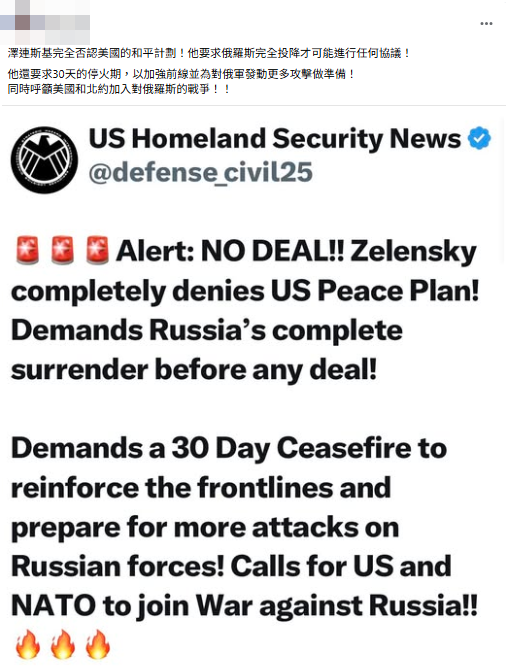 網傳「澤連斯基完全否認美國的和平計劃」、「要求俄羅斯完全投降才可能進行任何協議」的訊息。經查證,此說法出自一個用戶名稱為「US Homeland Security News」的 X 帳號,但它並不是美國國土安全部的官方 X 帳號,其發布之訊息也並非事實;澤倫斯基沒有要求俄羅斯投降、也沒有呼籲美國和北約加入對俄羅斯的戰爭,目前澤倫斯基是拒絕割讓任何領土以達成和平協議,並表示能和俄羅斯直接進行和平談判,不過前提是俄羅斯停火,但俄羅斯在本週又再度對烏克蘭發動攻擊,至本篇查核報告截稿前,和談尚無進展。