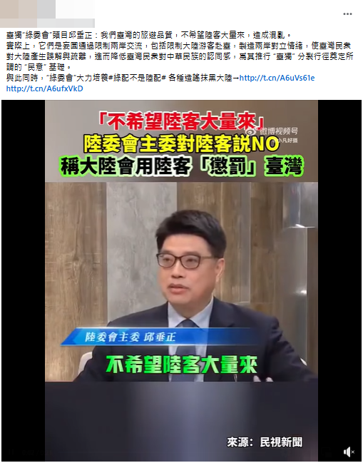 網傳陸委會主委邱垂正說「我們臺灣的旅遊品質,不希望陸客大量來,造成混亂」的訊息和影片。經查證,傳言影片來自邱垂正在 2024 年 12 月接受《民視》的獨家專訪,當時上海市副市長在雙城論壇上宣布要恢復上海居民赴台團體旅遊,邱垂正表示陸委會接到民眾 100 多通電話對此表示反對,複述民眾的意見,但傳言影片刻意剪輯成他本人對中國旅遊團來台的言論,網傳內容為錯誤訊息。