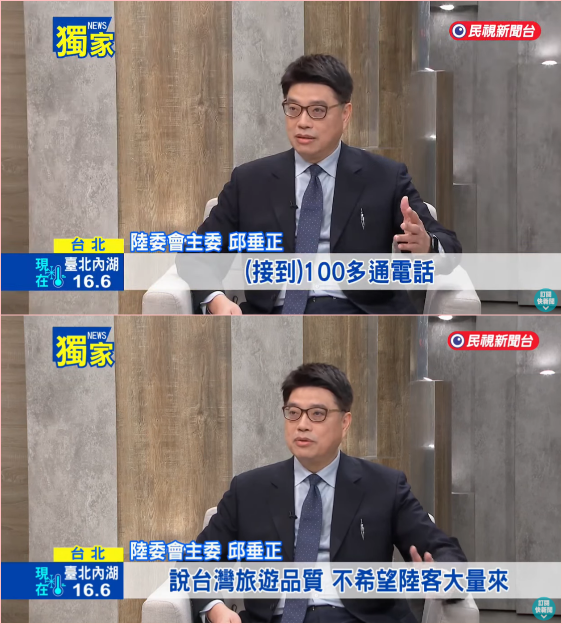 查核記者將網傳影片截圖反搜,查找到其來源為《民視》2024 年的獨家專訪,當時台北市舉辦雙城論壇,上海市副市長華源在論壇上宣布將恢復團客來台旅遊;邱垂正表示,消息一出,陸委會接到 100 多通電話,反對中國旅遊團來台。