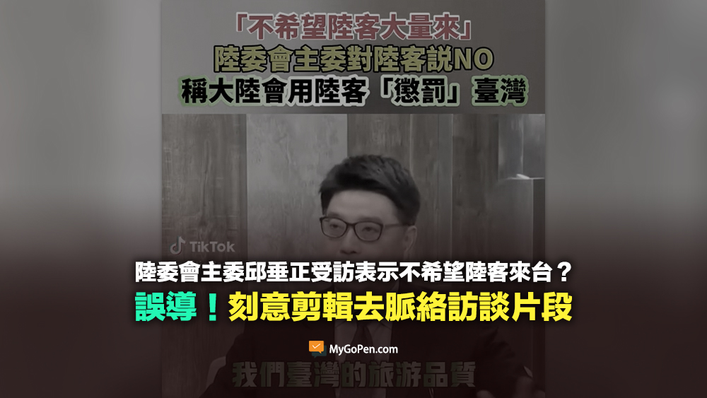 網傳影片為陸委會主委邱垂正 2024 年接受《民視》的獨家專訪,當時上海市在雙城論壇上宣布要恢復上海居民來台團體旅遊,邱垂正表示接到 100 多通電話,有許多民眾對此持反對意見,但傳言刻意擷取片段,塑造成邱垂正本人對中國旅遊團來台的意見,為錯誤訊息。