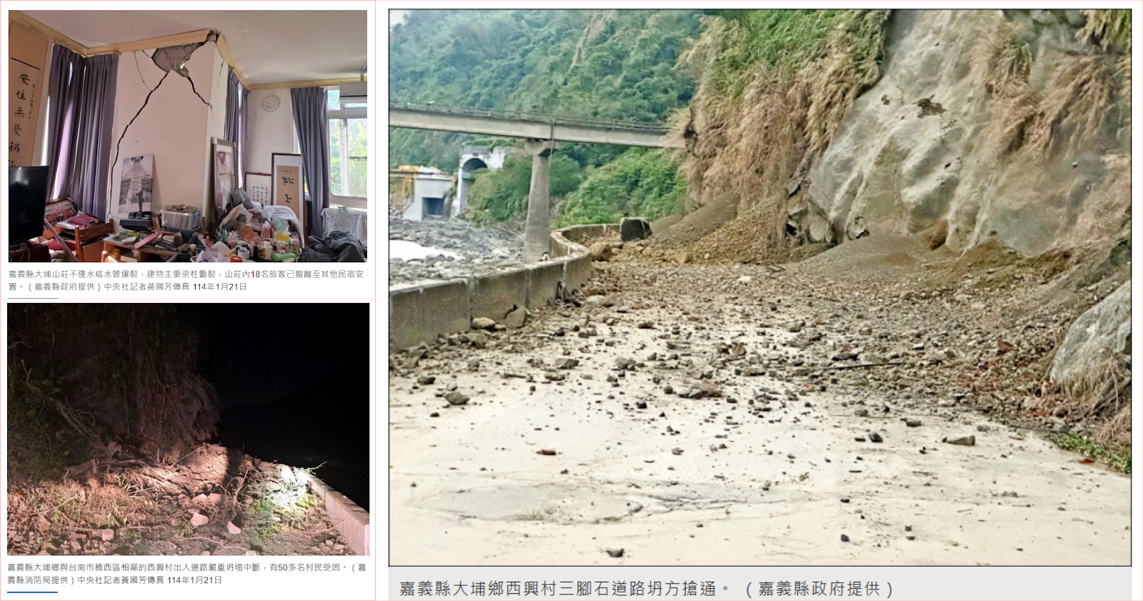 (一)2025 年 1 月 21 日 0 時 17 分,南台灣發生芮氏規模 6.4 地震,造成台南楠西多戶民房倒塌、嘉義大埔道路坍塌,新聞媒體報導和社群貼文流傳許多相關照片,但其中混用了和此次地震無關的畫面。