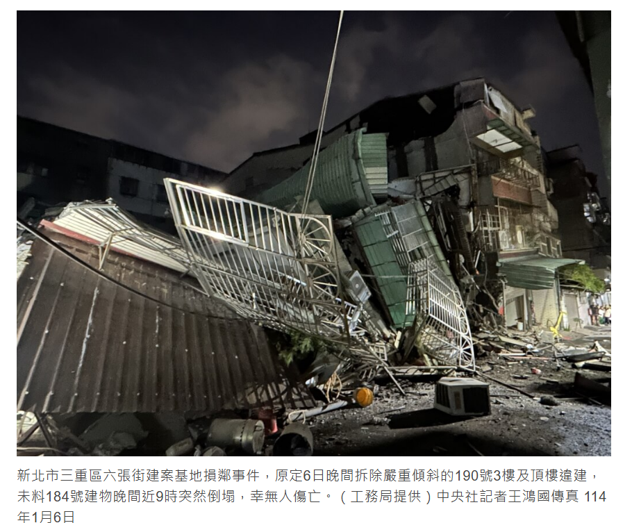 (二)多家媒體在報導台南楠西民宅倒塌的新聞中有一張建築物倒塌、結構受損的照片,經查證,此張照片其實是新北建案基地損鄰事件;根據《中央社》報導,2025 年 1 月 6 日上午,新北市三重區六張街一處工地開挖,卻造成鄰宅傾斜,嚴重影響居民安全。