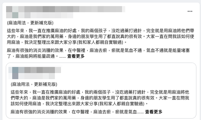 網傳「麻油用法」,提到對三十幾種病症有效,包括各種外傷傷口、跌打損傷,感冒、子宮、失眠、漱口殺菌等等。但專家表示,麻油並非抗生素無法殺菌,麻油本身並非無菌製造、塗抹傷口反而增加感染機會;而塗患部治跌打損傷、抹下腹部溫熱子宮、傷風感冒時擦身體能排毒,這些外用用途都只是增加氣血循環、不能誇大說成治病。