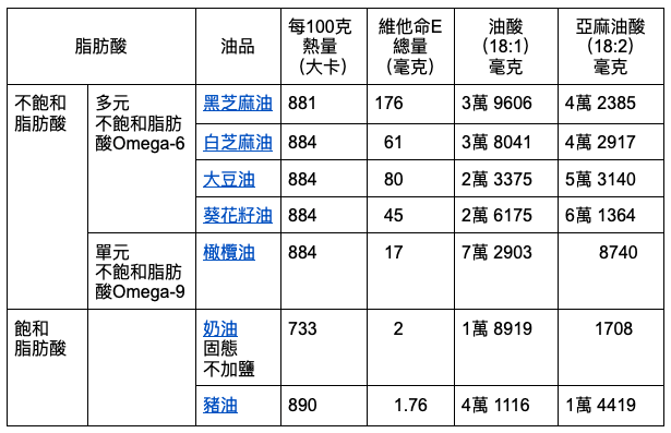 食藥署食品營養成分資料庫則顯示,「黑芝麻油」每百克的熱量為 881 大卡,維生素 E 總量為 176 毫克,油酸則為 3 萬 9606 毫克,亞麻油酸為 4 萬 2385 毫克,同樣也是芝麻、但是是白芝麻提煉的「白芝麻油」則為 884 大卡、61 毫克,油酸、亞麻油酸則與黑芝麻油相近,比較一般民眾常用的「大豆油」、「葵花籽油」、「橄欖油」、「奶油」、「豬油」,黑芝麻油的維他命 E 含量較高,但就像國健署上述的建議,各種油類有其不同營養及使用特性。