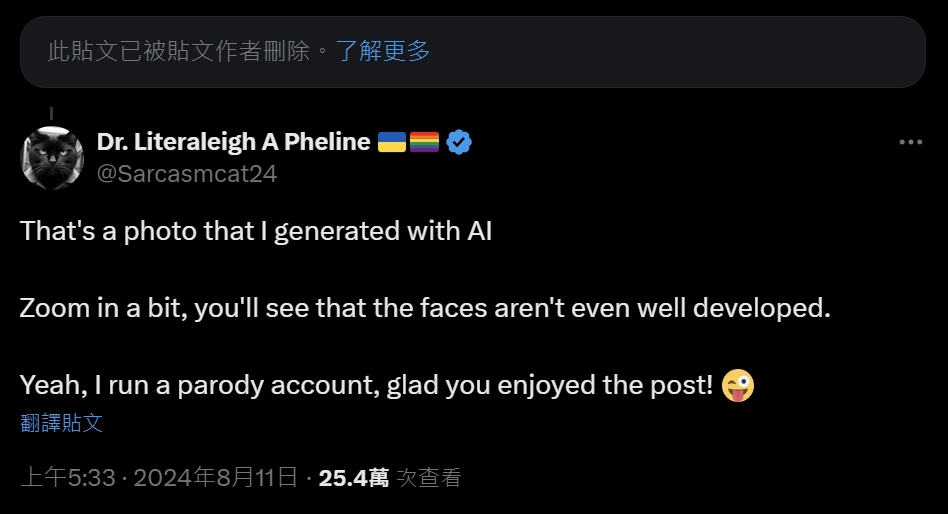 不過該用戶有註明自己是惡搞帳號(parody),而且原始貼文下方的留言他也都一一答覆,有網友詢問「他們的表情不真實」,Dr. Literaleigh A Pheline 回覆「因為他們不敢相信可以看到賀錦麗」,而他後來也說自己沒預料到這張圖片會在社群平台上瘋傳,而他也在回覆一則已刪除的貼文中,承認這是他用 AI 生成的圖片。