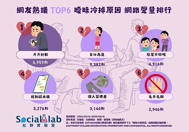 《Social Lab社群實驗室》本次透過《OpView社群口碑資料庫》追蹤近一年「曖昧冷掉原因」話題的網路聲量表現,帶您了解網友熱議造成曖昧冷卻的六大原因有哪些。