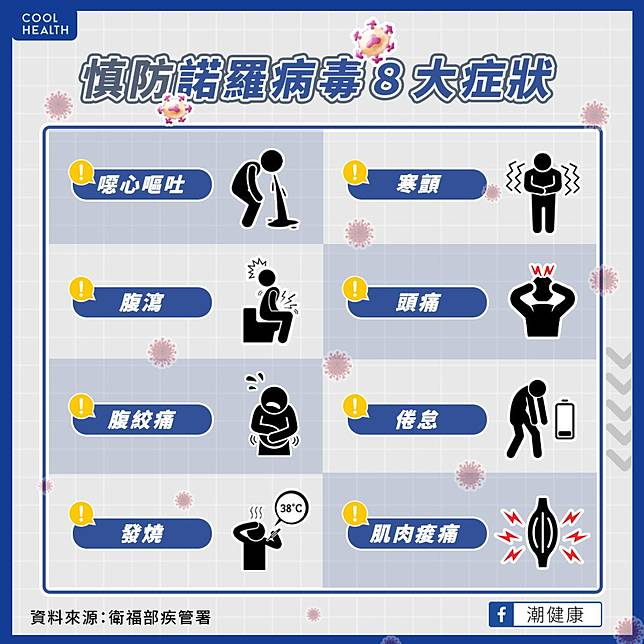 疾管署最新資料顯示,諾羅病毒感染引起之症狀,主要為噁心、嘔吐、腹瀉及腹絞痛,也可能合併發燒、寒顫、倦怠、頭痛及肌肉酸痛。一般而言,年紀較小的幼童嘔吐症狀較明顯。症狀通常會持續1至10天,之後會逐漸痊癒。