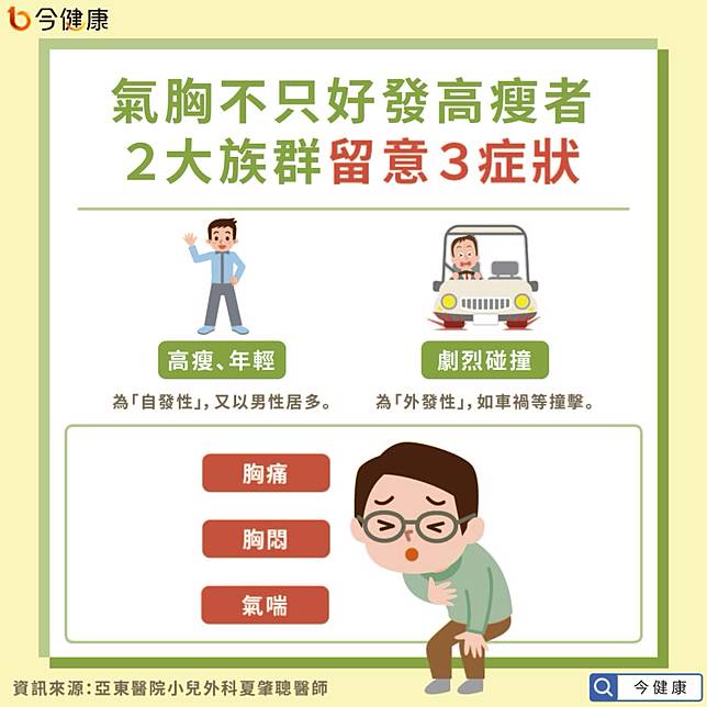 亞東醫院小兒外科夏肇聰醫師表示,氣胸可分為「自發性」和「外因性」,自發性如前述案例,常見於年輕、高瘦男性,也有少數年輕族群因肺部疾病引起。外因性則常因車禍、碰撞等外傷所致,此類型病患通常會合併肋骨骨折、氣管外傷。因此民眾如遇強烈撞擊後有胸痛的情況,也應盡速就醫檢查為佳,萬不可大意。