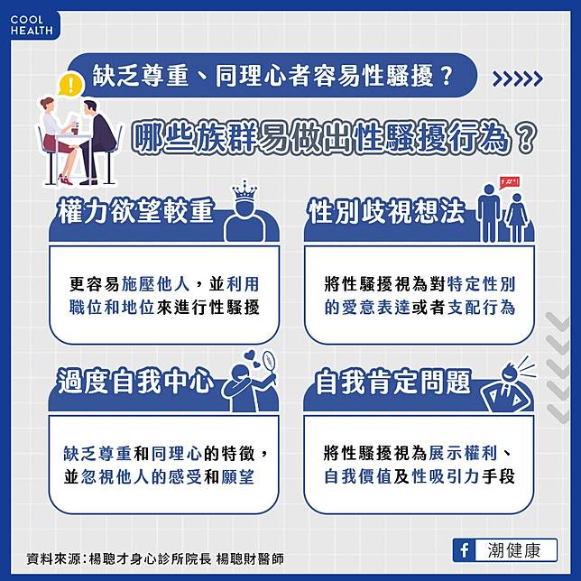 楊聰才身心診所院長、世新大學社會心理學系副教授楊聰財醫師接受潮健康專訪指出,發生性騷擾的高風險族群有幾種特質,首先,權力欲望較重的人可能更容易施壓他人進行性騷擾,他們利用職位和地位來進行性騷擾行為。 其次,性別歧視也是一個重要的因素,因多數加害者是男性,他們將性騷擾視為對特定性別的愛意表達或一種支配行為。再者,性騷擾加害者可能較有自我中心、缺乏尊重和同理心的特徵,他們忽視他人的感受和願望,將自己的需求置於他人之上。 「當然,性騷擾加害者也可能有自我肯定的問題,他們可會將性騷擾視為展示自己權利、自我價值,以及性吸引力的手段!」不過,楊聰財醫師提醒,性騷擾加害者的行為心理特質未必與外表有關,穿著打扮衣冠楚楚者也可能發生性騷擾事件,不能將外表和性騷擾行為聯繫在一起。 楊聰財醫師表示,單次發生性騷擾的案例比例較高,但一部份為「低危險高再犯」的族群,有可能與特殊性癖好如觸摸癖,或是人格障礙如邊緣型人格障礙、思覺失調症的幻覺症狀有關,應針對其精神狀態介入適當治療。