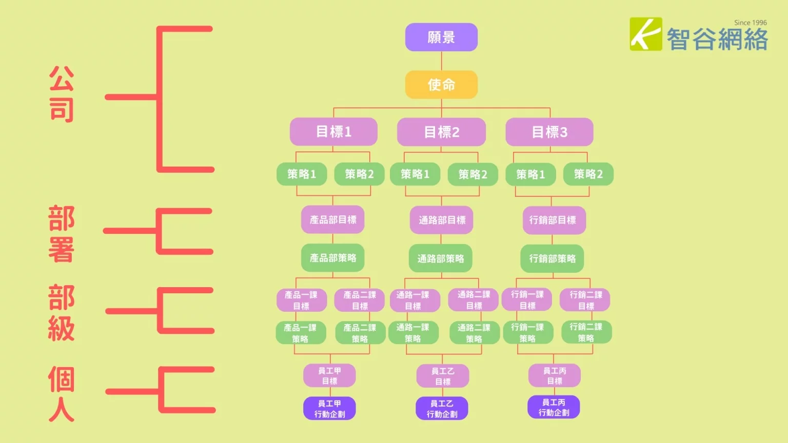 在制定目標及策略的過程,其中一個很重要的概念是「逐級推展」,也就是下級會根據上級的策略制定出該部門的目標及策略,員工又會根據部門的策略訂定個人的目標及行動計劃,如此往下層層推展、彼此關聯,形成目標的遞延(如下圖)。而從整體來看,此一目標設定的TOP-DOWN就是MBO最基本的精神。