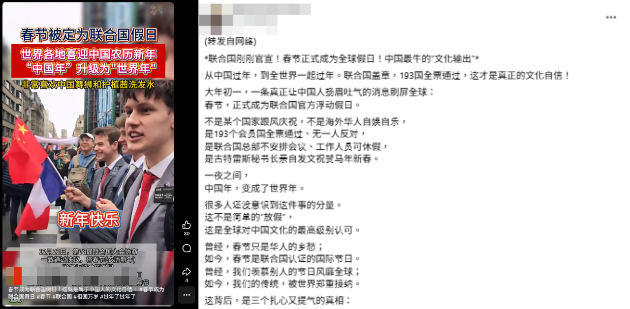以關鍵字在 Facebook 上搜索,會發現用戶「爱我中华/愛我中華/Love My China」於 2026 年 2 月 17 日即發布過類似內容,影片字幕顯示「12月22日,第78届联合国大会协商一致通过决议,将春节(农历新年)确定为联合国假日…」。