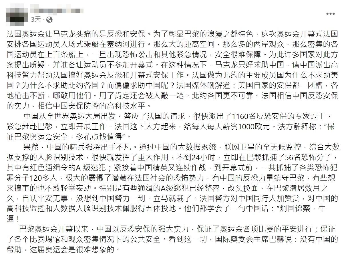 網傳「中國支援巴黎奧運維安」的訊息,內容聲稱法國總統馬克宏求助中國,希望在巴黎奧運期間可以協助維安任務,中國則派出 1,160 名反恐安保人員,並於開幕式前抓到 120 多名恐怖份子。經查證,法國於 2024 年 1 月時曾向全球 46 國提出維安支援請求,包括美國、加拿大、西班牙、英國、德國、卡達、印度、南韓等皆有派遣警察及偵防犬,總計大約 1,700 多人,不過並沒有提到中國也有派遣警察支援,中國與法官政府以及國際媒體,並未有任何相關的報導或聲明,傳言提到的各項數據也沒有資料佐證,網傳訊息沒有事實依據。