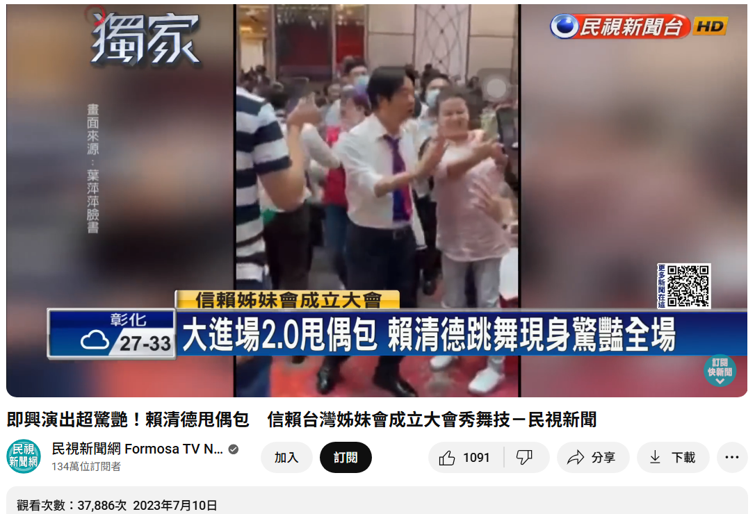 民視新聞網 Formosa TV News network YouTube - 即興演出超驚艷!賴清德甩偶包 信賴台灣姊妹會成立大會秀舞技-民視新聞