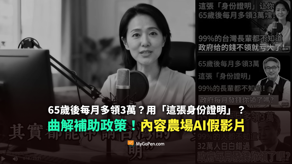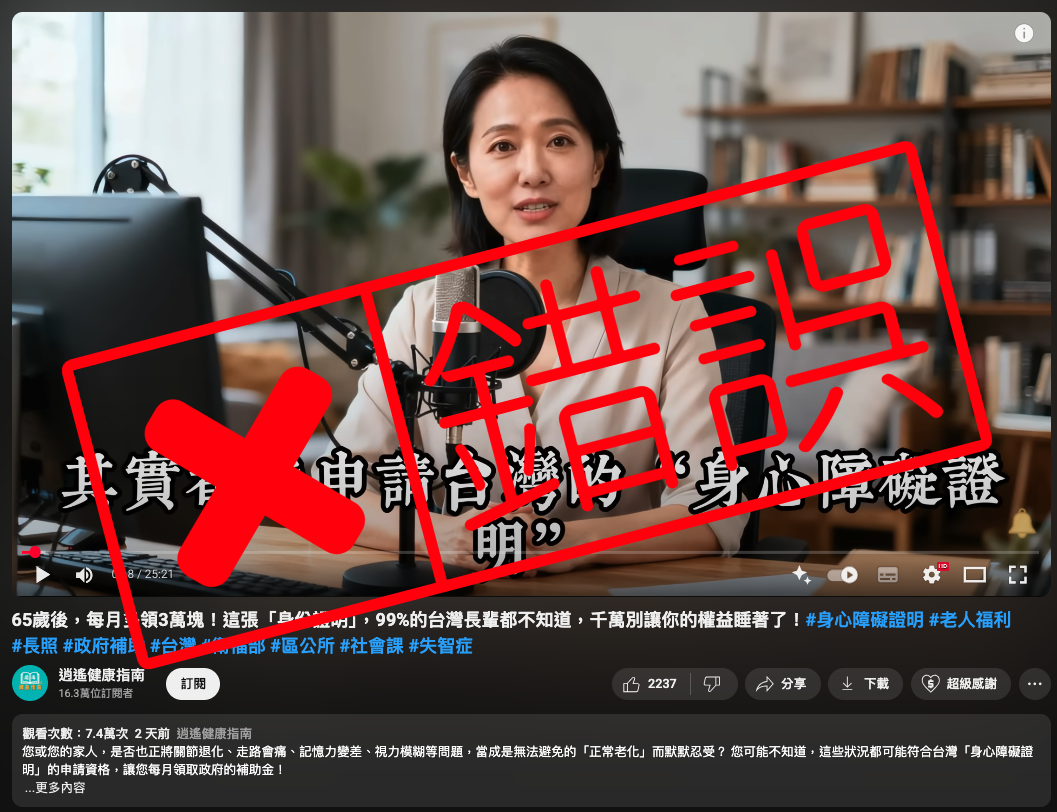 【錯誤】65歲後每月多領3萬?用這張「身份證明」?內容農場AI假影片!曲解身心障礙證明及補助政策