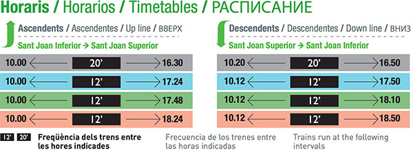 平均 12分鐘一班車,但如果是淡季就會減少到 20分鐘一班車,從山腳到山頂約需要 20分鐘的車程