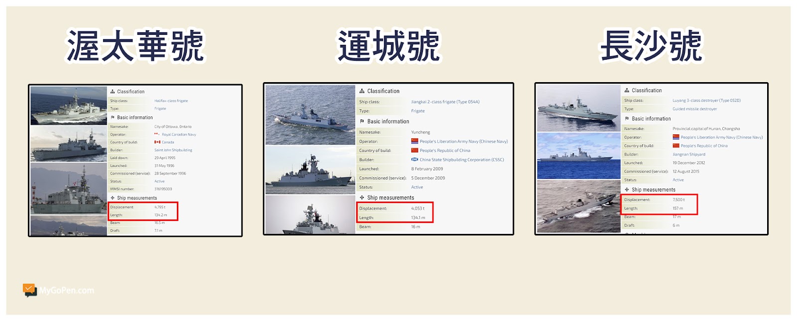 根據 Ships Hub 上的資料顯示,渥太華號的排水量約為 4,795 噸,長度約 134.2 公尺;運城號的排水量為 4,053 噸,長度約 134.1 公尺;長沙號的排水量為 7,500 噸,長度約 157 公尺。由此可知,渥太華號與運城號排水量差距不大,船身長度幾乎相同,與網傳圖片顯示的 3 艘軍艦船隻,比例尺明顯不符合