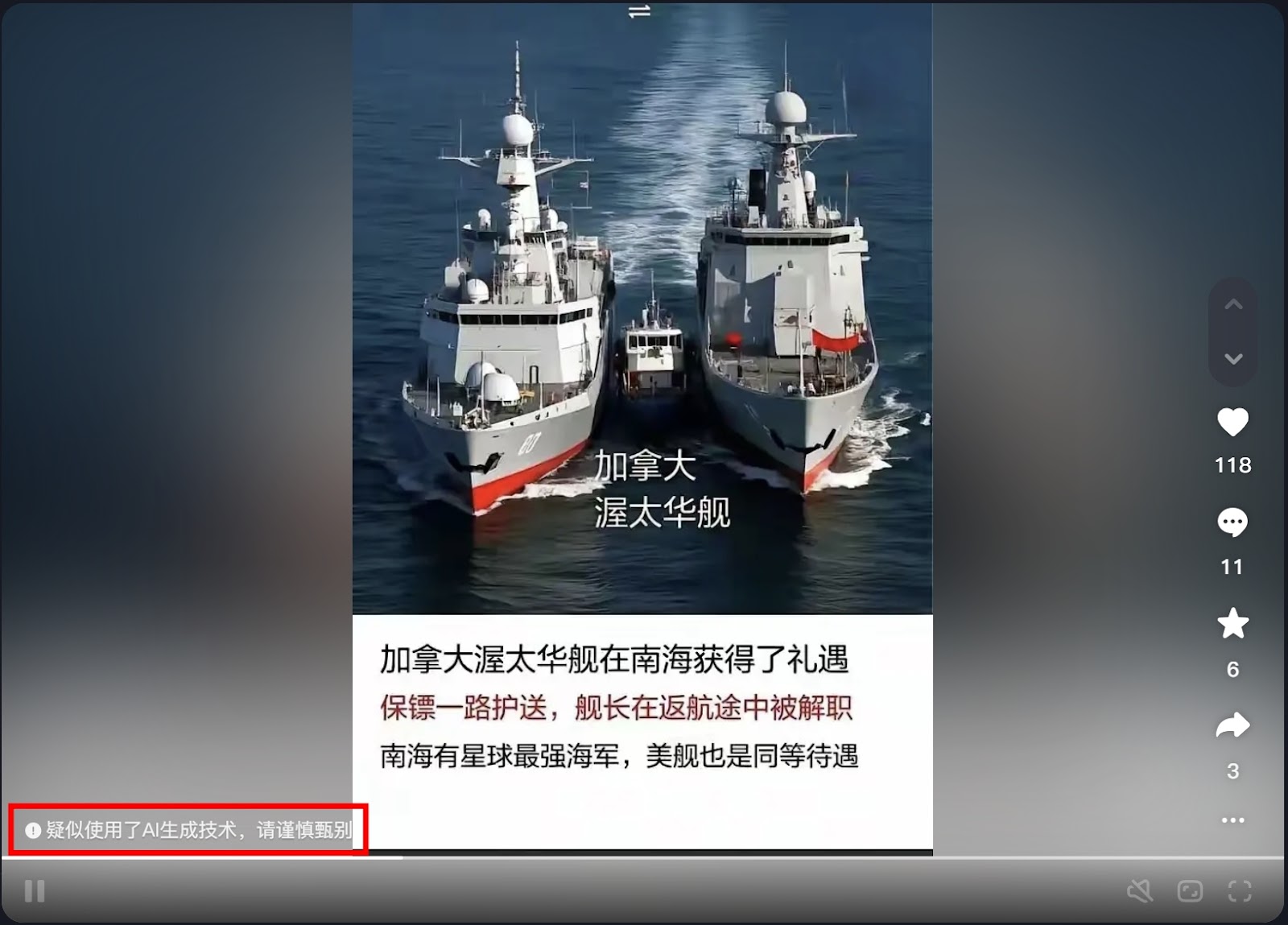 網傳「渥太華艦來南海」的圖片及訊息,內容聲稱加拿大渥太華號(FFH 341)在南海航行時,遭到中國長沙號及運城號包夾,並附上一張小船被 2 艘軍艦夾擊的照片。經查證,渥太華號於 1 月執行南海航行任務時,確實有遭到長沙號與運城號跟隨,但距離最近也是在 2 英里(約 3.2 公里)外,並無出現「併行」或是「包夾」的情況;渥太華號艦長於 2025 年 2 月 7 日遭撤換,加拿大海軍稱此人事調動是因艦長「失去信任」,但「不涉及任何形式的不當行為」,沒有證據顯示與南海任務有關。至於網傳圖片,有多處細節模糊不清,高機率為 AI 生成圖片,且圖片中的船隻無論外觀、大小,皆與傳言提到的 3 艘軍艦不同,網傳訊息誇大實際情況,並搭配錯誤的圖片,容易造成民眾誤解。