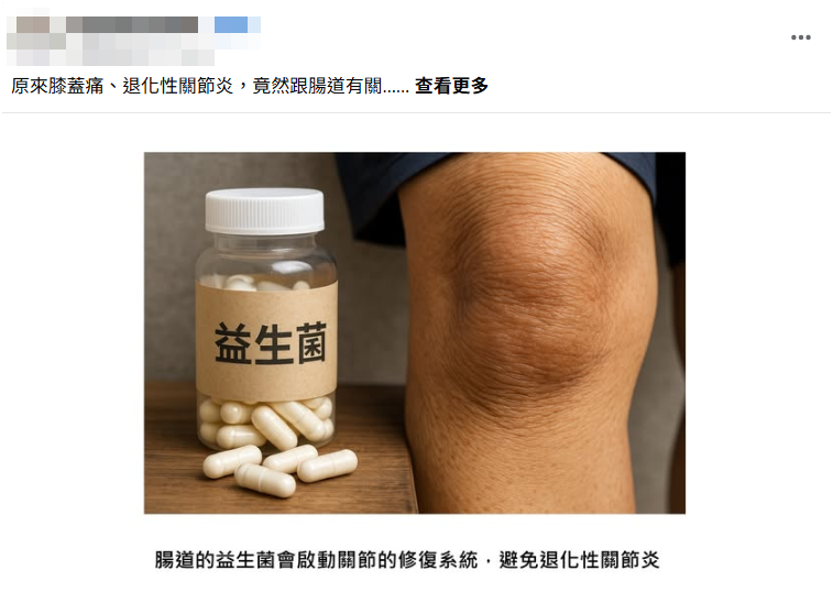 網傳「膝蓋痛、退化性關節炎與腸道有關」的內容,引述相關研究指出,退化性關節炎除關節磨損外,亦可能與「腸道—關節軸線(gut-joint axis)」異常有關,該軸線串起腸道菌、膽汁酸代謝、內分泌調節與關節修復能力。然而,專家指出,腸道健康主要與細胞激素活化免疫、調節發炎有關,傳言將「降低發炎」誤解為「直接修復關節」,屬錯誤說法。此外,傳言中提及的 UDCA 為肝膽用藥,GLP-1 則為治療肥胖、糖尿病及腎病的藥物。傳言引用動物實驗結果,去說明未獲藥證適應症許可的疾病,不僅容易誤導大眾,亦有變相鼓勵「仿單標示外使用」之嫌。