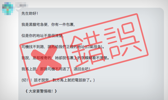 網傳相同的描述說法,MyGoPen 在 2016 年就有查證過「【錯誤】黑貓宅急便人員急問:司機找不到路?沒有接獲報案」,類似傳言大約從 2013 年就在 LINE 流傳,經查證,當時警方坦言暫時還沒有接獲任何報案,是杜撰的故事還是確有其事根本不得而知,真實性有待查證。