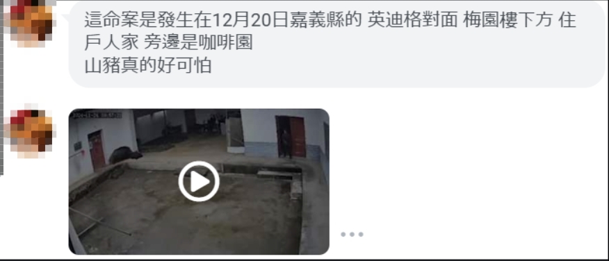 網傳「山豬真的好可怕」的影片及訊息,畫面是一頭野豬闖入民宅,並多次攻擊老婦的影片,內容聲稱是 12 月 20 日發生在嘉義縣阿里山公路附近咖啡園的事件。經查證,網傳影片實際發生地點在中國陝西省安康市嵐皋縣佐龍鎮黃興村,當地時間 11 月 24 日,一頭野豬為了躲避獵犬追捕,闖入一處民宅,聽到聲響後,屋內一名 76歲婦人外出查看,結果慘遭野豬攻擊,送醫後不治身亡,該起事件並非發生在台灣,日期也不是 12 月 20 日,網傳訊息不正確。
