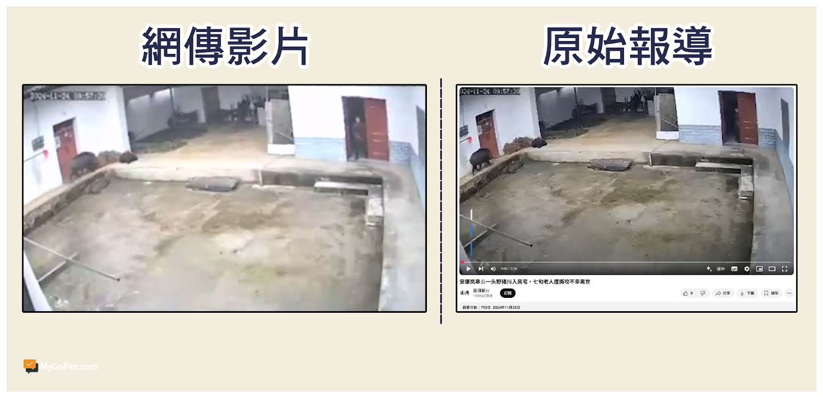 MyGoPen 利用圖片反搜工具「Google Lens」進行搜索,可以找到 YouTube 頻道「澎湃新闻」於 2024 年 11 月 25 日發布的影片《安康岚皋县一头野猪闯入民宅,七旬老人遭撕咬不幸离世》,經檢視後確認與網傳影片相同,可以得知這並非近期發生在台灣的事件