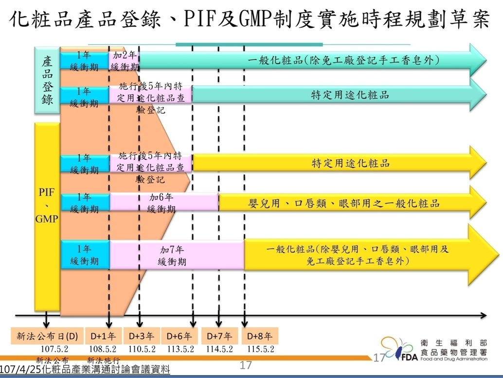 延續上述政策,食藥署於 2024 年 7 月 1 起廢除「特定用途化粧品」的管理類別,避免民眾誤解「特定用途化粧品」具有特定療效,改與國際接軌、採用單一類別進行管理,並且公告相關的分階段時程,推行化粧品產品登錄制度、建立產品資訊檔案,並導入化粧品安全資料簽署人員制度(Safety Assessor,SA),原「特定用途化粧品」自2024 年 7 月優先實施 PIF、GMP 等相關管理制度,「嬰兒用、口唇類、眼部用」則是 2025 年,「一般化妝品」則是 2026 年,而根據「化粧品範圍及種類表」,包括洗髮精、洗髮乳、洗髮霜、洗髮凝膠、洗髮粉、其他,都屬第一類的「洗髮用化粧品類」。