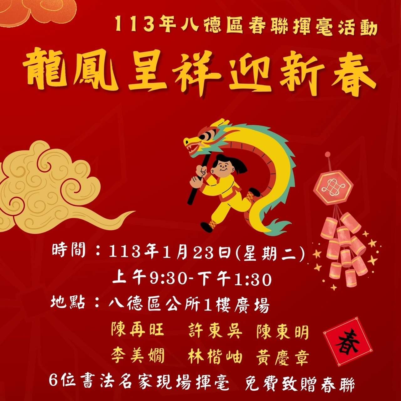 金龍年將至,桃園市八德區公所與桃園市八德藝文協會將於1月23日上午9點30分至下午1點30分,在八德區公所1樓廣場共同舉辦「龍鳳呈祥迎新春」活動,免費贈送春聯,邀請民眾一同參與,提前感受年節氣氛。