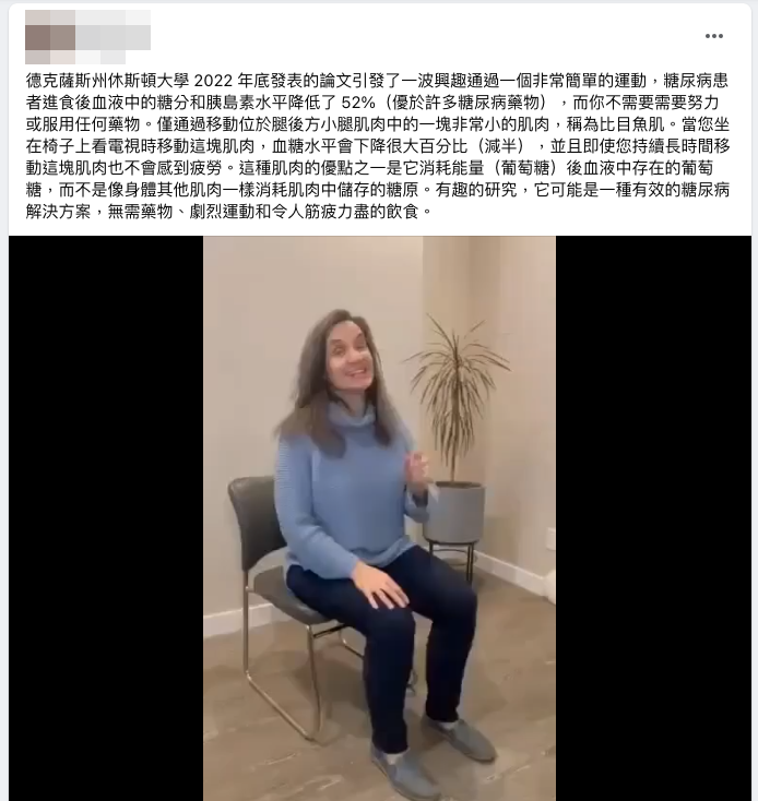 網傳「糖尿病患者福音」的影片訊息,宣稱小腿肌肉中的一塊非常小的「比目魚肌」,即使坐在椅子上時都能靠著抬腳跟運動這塊肌肉,就能使糖尿病患者進食後的血糖降低 52%,優於許多糖尿病藥物,不用其他藥物、運動或飲食控制。對此專家澄清指出,該論文只達高中科學競賽的科學研究程度,過去已有相關研究也能證實其他規律運動對糖尿病有所幫助,呼籲病患仍須以常規治療為第一優先。