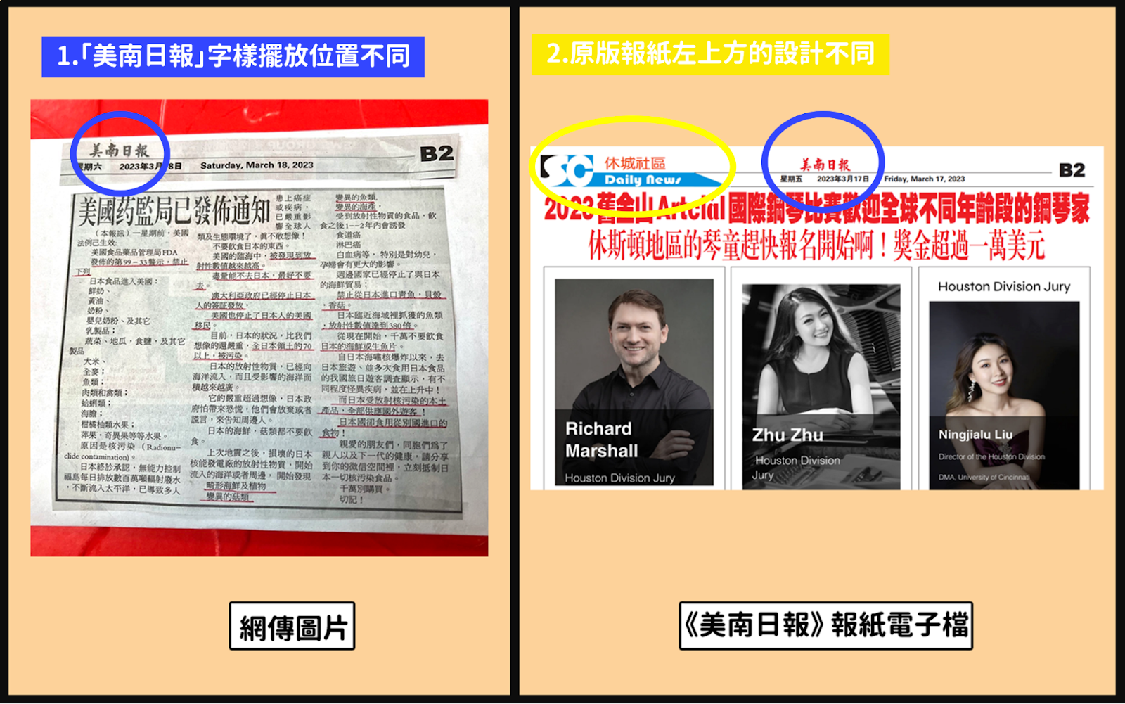 主要原版報紙中「美南日報」這四個字擺放的位置是在中間,但網傳圖片這四個字是放在左上角;且原版報紙的左上方有「SC Daily News 休城社區」的字樣設計,而網傳圖片卻沒有,判斷網傳拍攝圖片來自於紙本內容。