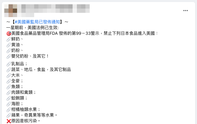 【錯誤】美國藥監局發布通知禁止下列日本食品進入美國報導?中國資深謠言改編